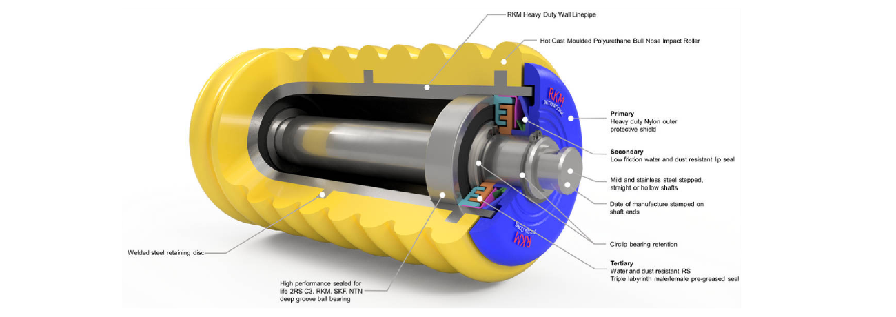 The RKM Heavy Duty Cast Polyurethane Roller is a proven performer in materials handling environments such as coal, iron ore and grain. The impact disc’s are available in 2 different profiles depending on our customers preference. The rollers quality construction, triple layered sealing package and additional outer cover make the RKM Heavy Duty Cast Polyurethane Roller a great option when looking for a more durable and hard wearing alternative to rubber. The roller is also available with an extensive list of product upgrades to meet your specific operating conditions.