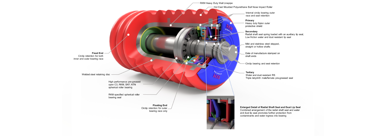 The RKM Super Heavy Duty Cast Polyurethane RollerĀ has been designed to handle extreme impact situations where high tonnages or extra large lumps are being conveyed. The moulded one piece bullnose polyurethane design effectively absorbs and then distributes loads back through the roller and onto the conveyor structure. The roller utilises spherical roller bearings and increased sealing protection to deal with the harsh environments these rollers have been designed to operate in. The roller is also available with numerous product upgrades to meet your specific operating conditions.